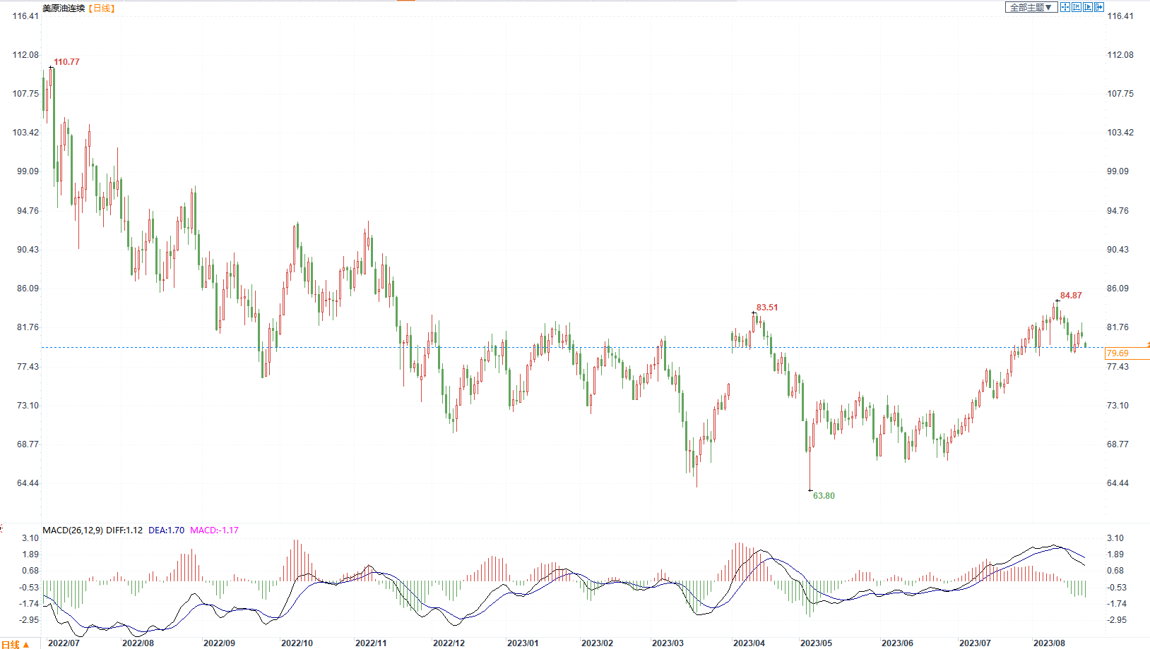 周二国内原油期货高开后震荡下跌。7月份美国新订单疲弱、利率高企、消费者对商业环境前景乐观情绪下降,以及制造业工作时间减少,推动领先指标月率下降0.4%。这继续表明,未来几个月经济活动可能会减速,并陷入温和收缩。对全球经济疲软的担忧再起,全球闲置产能增加也打压石油市场气氛,国际油价小幅下跌。据国际能源署数据显示,欧佩克及其减产同盟国可在90天内达到并可长期保持的产能每日可达到4941万桶,闲置产能每日571万桶。欧佩克10国可持续产能日均3382万桶,闲置产能每日有528万桶,占全球产量的5%以上。美国驾车高峰季节已经接近尾声,并将于9月1日结束。截至8月18日的一周,美国汽油需求和馏分油需求已经减少;截至8月18日的四周,美国汽油需求和馏分油需求移动平均数也低于去年同期水平,可能反映了美国经济衰退的趋势。技术面,油价已经透支了未来上涨空间,短期或高位震荡调整。操作建议:震荡偏空。