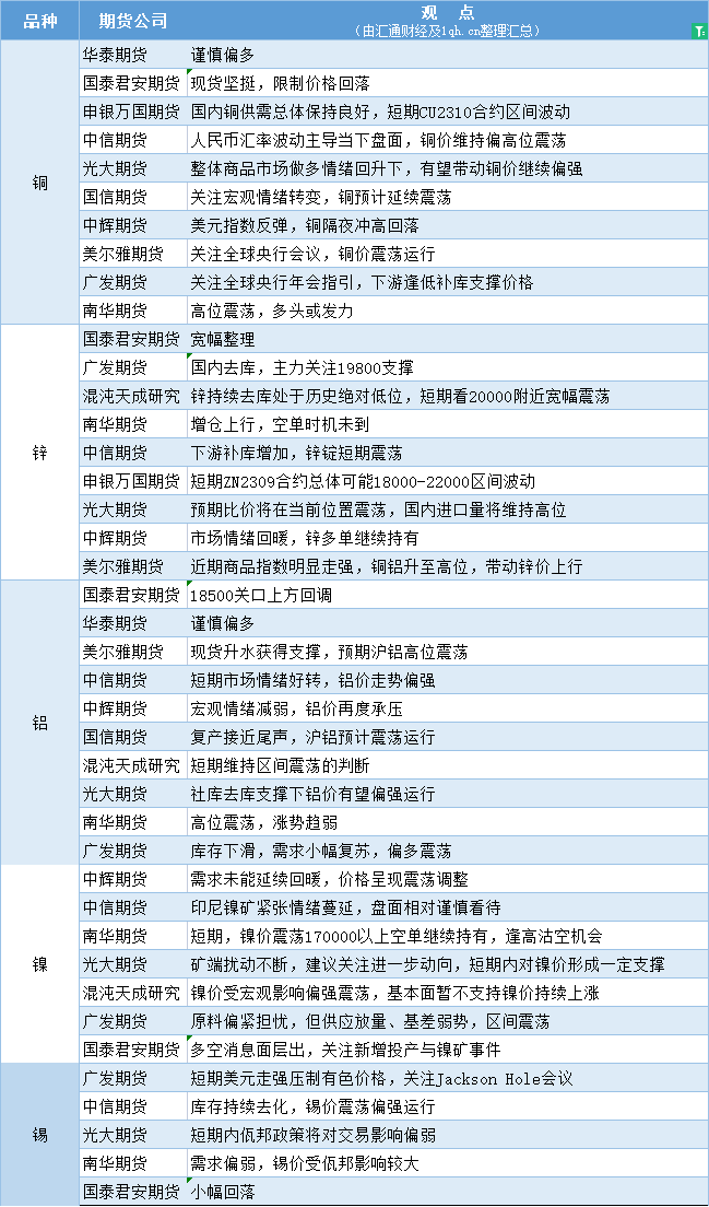 标题:期货公司观点汇总一张图:8月25日有色系(铜、锌、铝、镍、锡等)