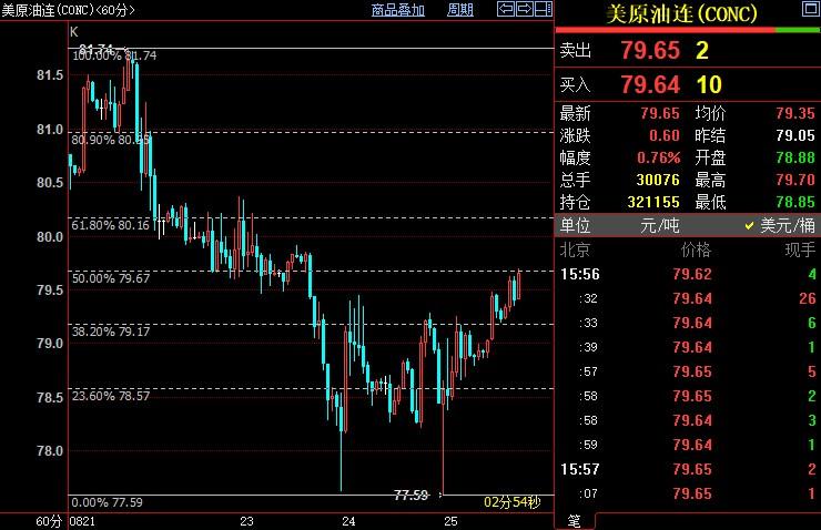 北京时间15:58,NYMEX原油期货上涨0.76%至79.65美元/桶;ICE