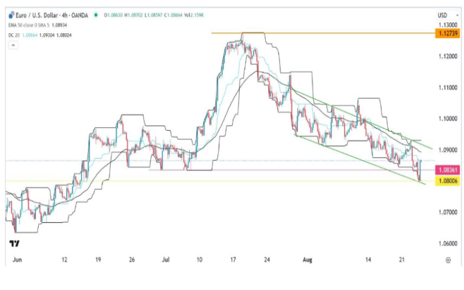欧元兑美元在 7 月份触及峰值 1.1273 后正处于强劲的看跌趋势。在4小时图上,它已形成下降通道,以绿色标记。周三它重新测试了通道的下侧。该货币对也跌破 50 周期移动平均线。