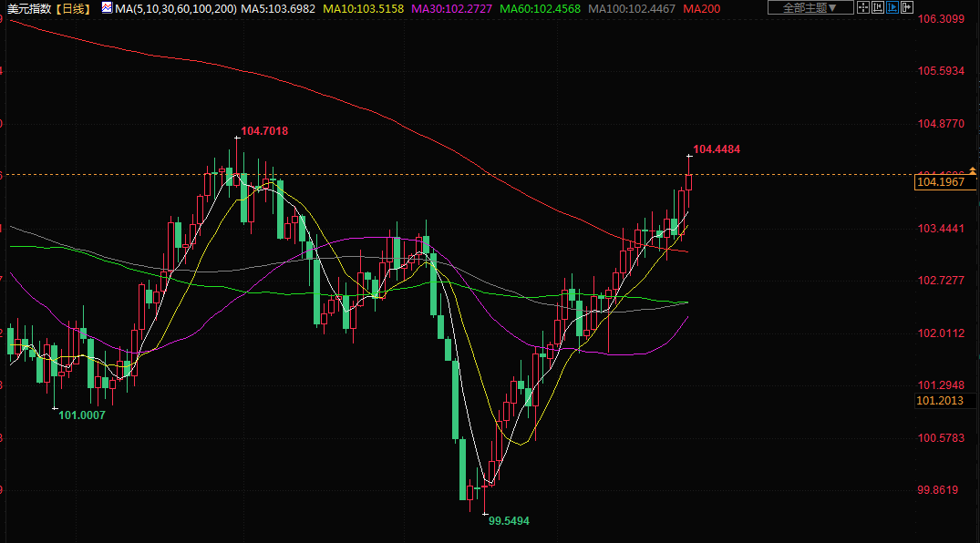 美元指数基本持平于104.06,盘中一度触及6月1日以来最高104.44。