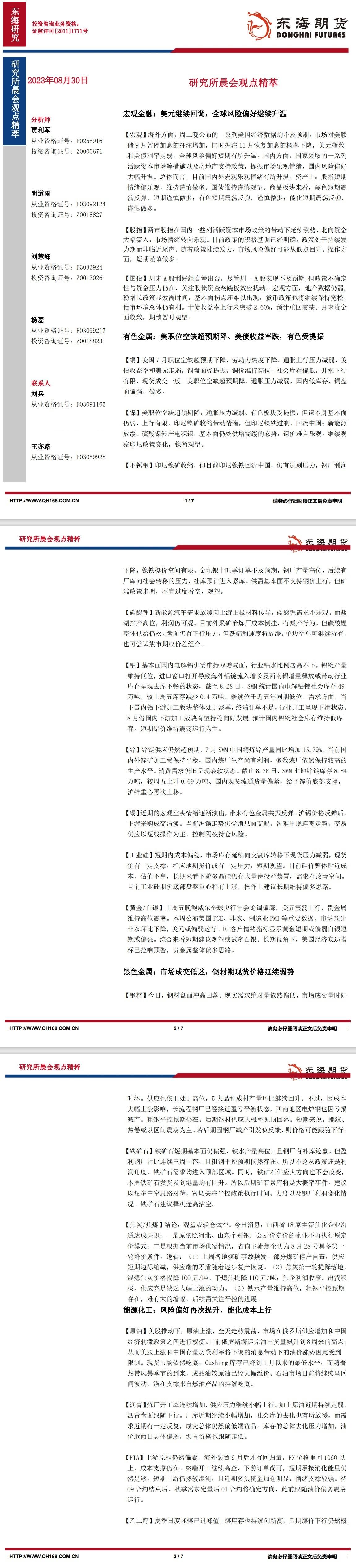 标题:【东海期货8月30日研究所晨会观点精萃】美元继续回调,全球风险偏好继续升温