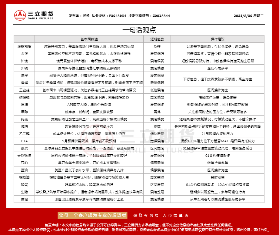 标题:三立期货8月30日沪金、沪银、原油、有色金属等期货操作建议