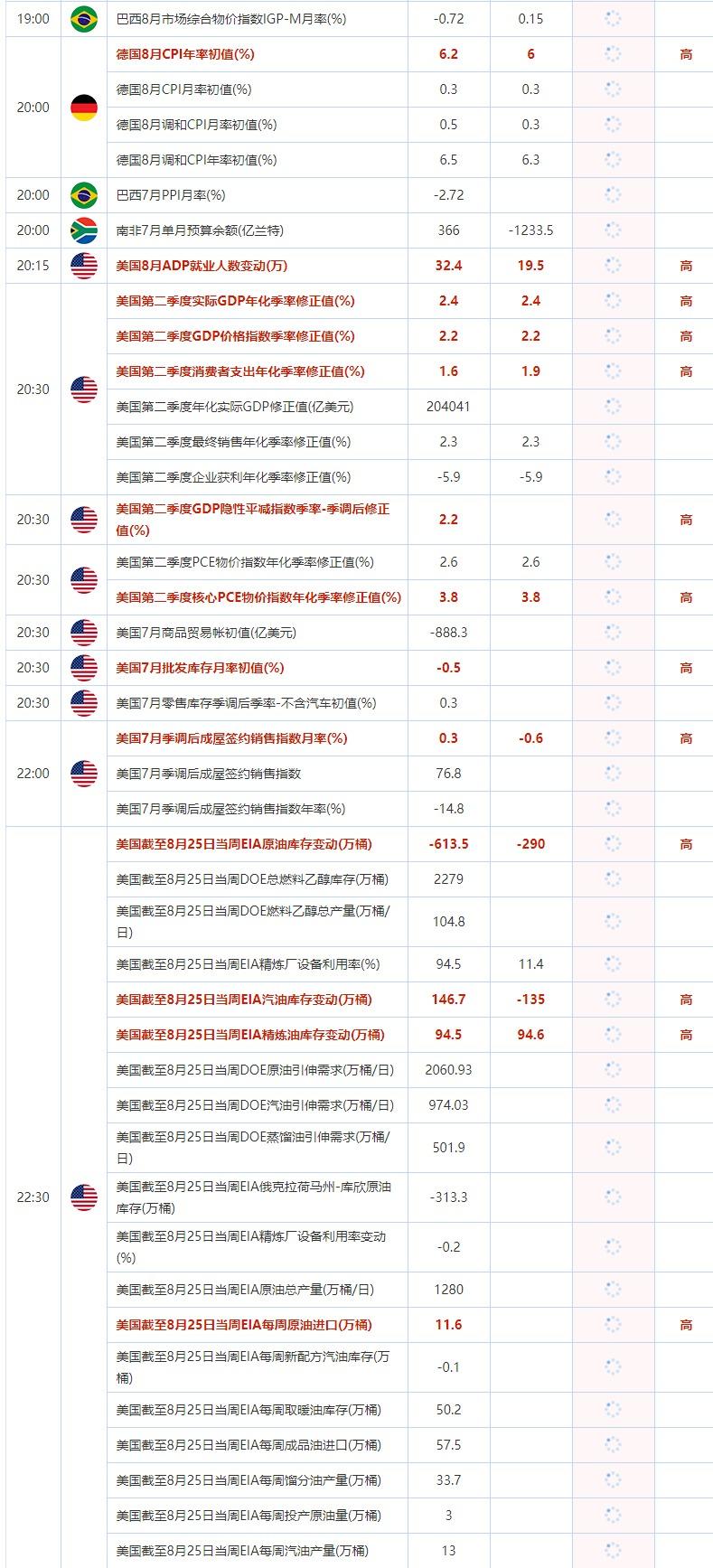 20:30 美国第二季度核心PCE物价指数年化季率修正值(%) , 前值 3.8 , 预期值 3.8 , 公布值:待发布20:30 美国7月批发库存月率初值(%) , 前值 -0.5 , 预期值 -- , 公布值:待发布20:30 美国7月零售库存季调后季率-不含汽车初值(%) , 前值 0.3 , 预期值 -- , 公布值:待发布22:00 美国7月季调后成屋签约销售指数月率(%) , 前值 0.3 , 预期值 -0.6 , 公布值:待发布