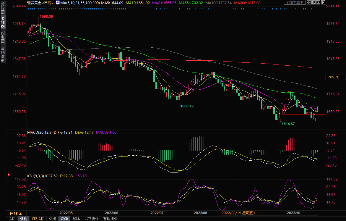 整体来看,美联储政策或将迎来拐点的预期有所升温,令美元上涨动能减弱,美债收益率回调的风险也有所增加,这将吸引逢低买盘支撑金价,技术面看涨信号有所增加,地缘局势紧张,金价短线仍有进一步反弹机会,关注1729-1617跌势的61.8%回撤位1686附近阻力压制。不过,预计反弹走势将极为波折,而且需要留意市场对美国9月PCE数据的预期变化,市场预计该数据将为美联储进一步激进加息提供支撑,料将压制金价的反弹空间,下方关注5日均线1644附近支撑。北京时间11:01,