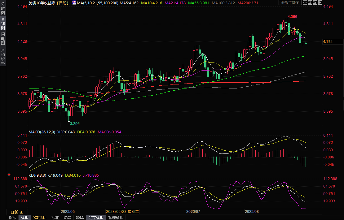美债收益率方面,美国国债收益率周三变化不大,盘中走势震荡,一度触及三周最低,美国经济增长和劳动力市场数据弱于预期,降低了美联储今年晚些时候加息的预期。10年期美债收益率中线走势偏空,可能会跌向55日均线3.981%附近,有望继续支撑金价走势;但4%整数关口存在心理支撑,需要提防首次触及该位置后短线小幅反弹的可能性。