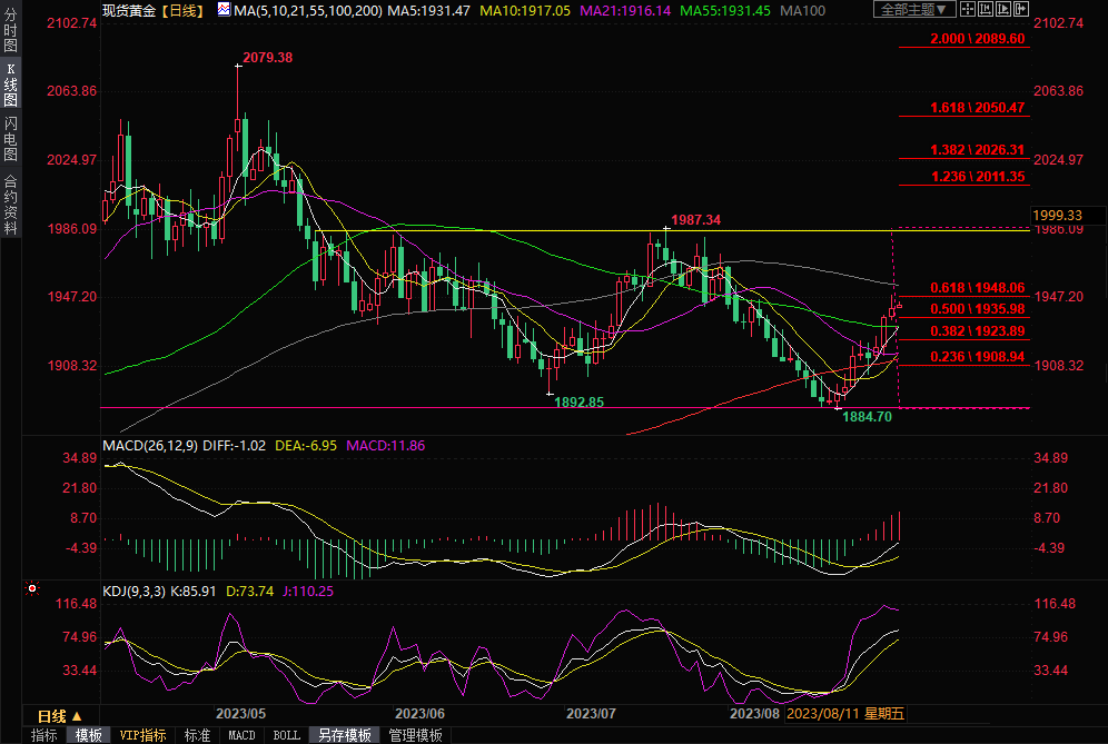 美元指数震荡微跌,目前交投于103.10附近,延续隔夜弱势,金价暂时守在四周高位,目前交投于1944.31美元/盎司附近。新的经济数据显示美国经济降温,强化了美联储将在9月暂停加息的预期,隔夜