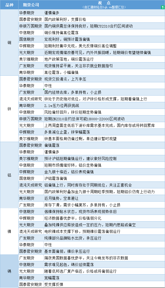 标题:期货公司观点汇总一张图:9月1日有色系(铜、锌、铝、镍、锡等)