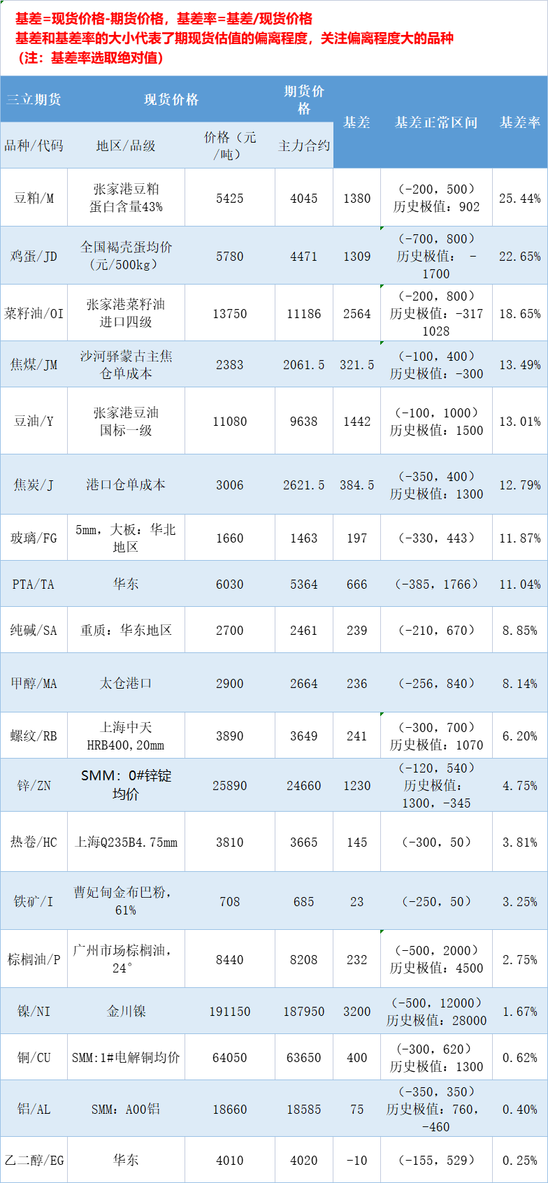 三立期货10月24日基差:一张图尽览有色金属、黑色系、能源化工和农产品基差(按基差率从大到小排序)——排名前三的期货品种分别是豆粕、鸡蛋、菜籽油,基差率分别是25.44%、22.65%、18.65%。
