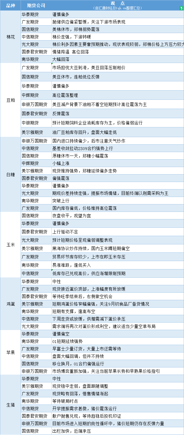 标题:期货公司观点汇总一张图:9月5日农产品(棉花、豆粕、白糖、玉米、鸡蛋、生猪等)
