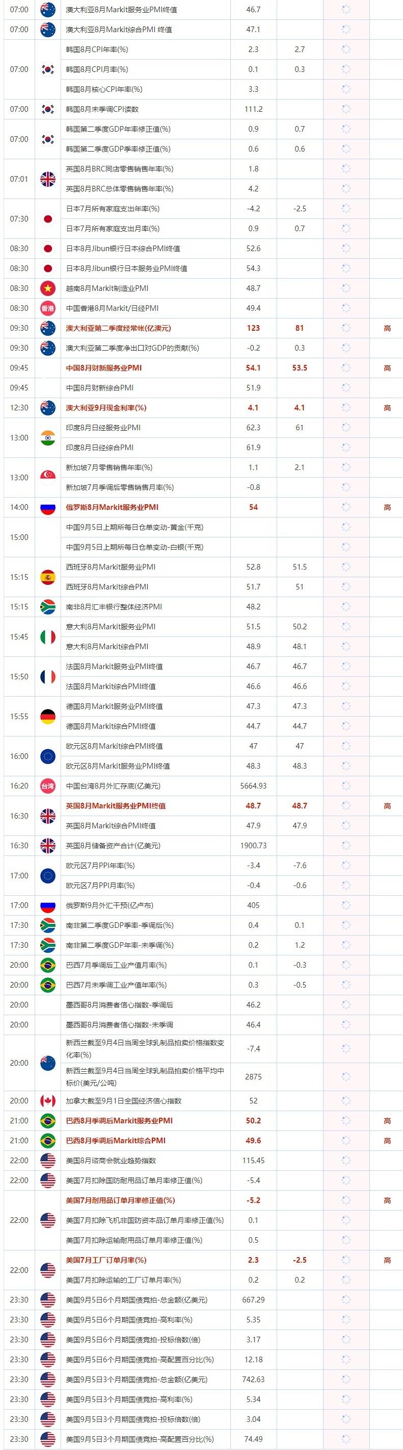 09:45 中国8月财新服务业PMI , 前值 54.1 , 预期值 53.5 , 公布值:待发布09:45 中国8月财新综合PMI , 前值 51.9 , 预期值 -- , 公布值:待发布