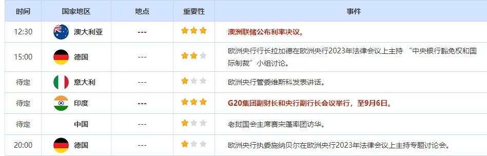 12:30 澳大利亚9月现金利率(%) , 前值 4.1 , 预期值 4.1 , 公布值:待发布13:00 印度8月日经服务业PMI , 前值 62.3 , 预期值 61 , 公布值:待发布