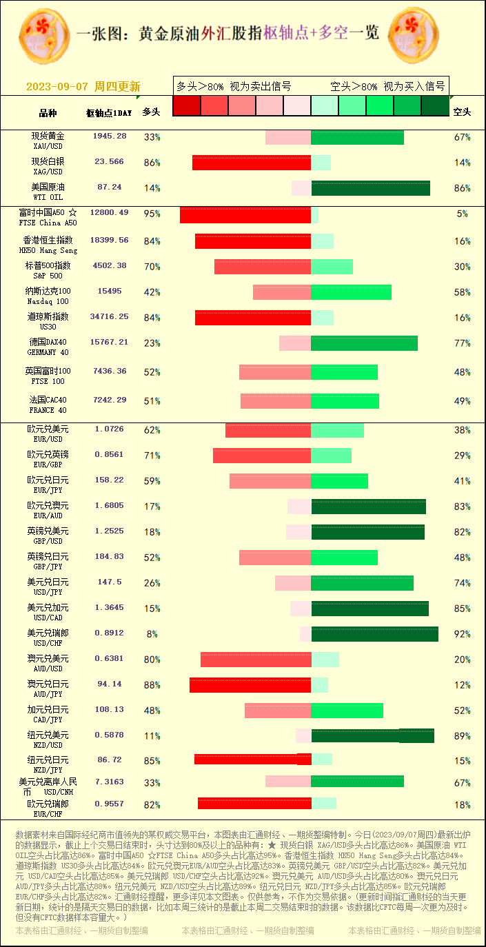 标题:一张图:2023/09/07黄金原油外汇股指"枢纽点+多空占比"一览