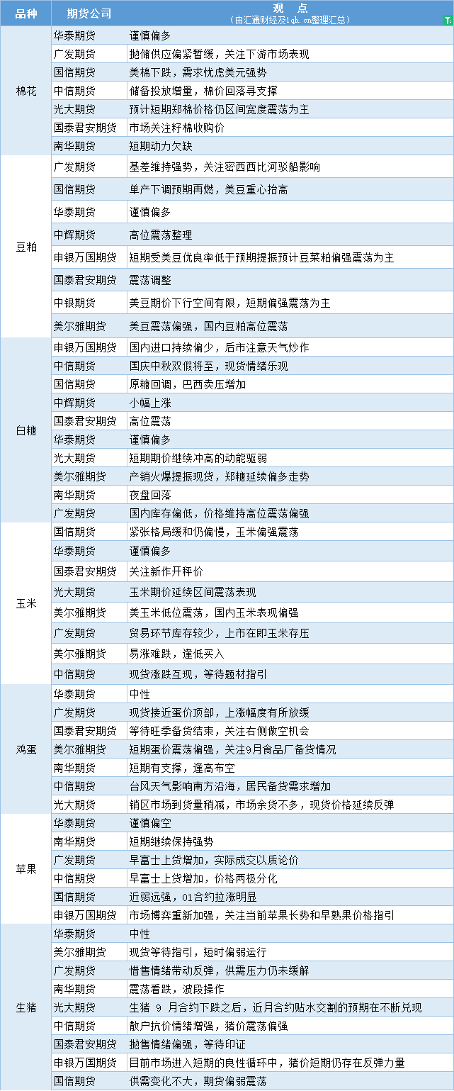 标题:期货公司观点汇总一张图:9月7日农产品(棉花、豆粕、白糖、玉米、鸡蛋、生猪等)