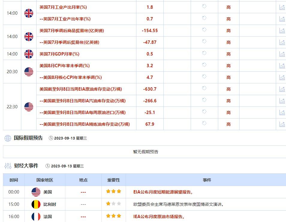 9月12日,英国央行货币政策委员曼恩将发表讲话,投资者需关注他的最近观点。英国央行将在9月21日举行利率决议,由于市场越来越预计英国央行将暂停加息。 ③9月13日(周三)关键字:美国8月CPI,美国截至9月8日当周API和EIA原油库存变动