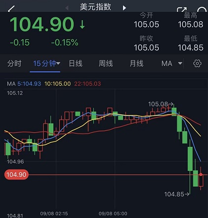 汇通财经APP讯——周五(9月8日)亚市盘中,美元指数短线突然一波跳水,最低触及104.85附近,跌幅约0.2%,回吐了隔夜大部分涨幅。知名财经网站FXDailyReport分析师Nicholas Kitonyi最新撰文,对美元后市走势进行分析。