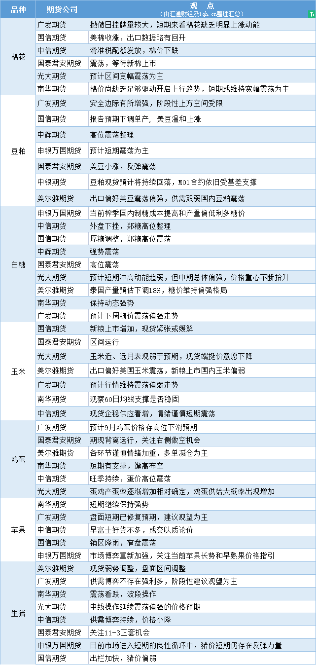 标题:期货公司观点汇总一张图:9月11日农产品(棉花、豆粕、白糖、玉米、鸡蛋、生猪等)