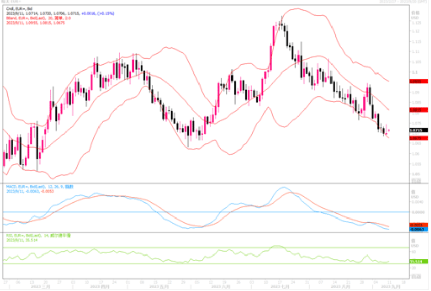 上周五(9月8日),纽约尾盘,欧元/美元持平于1.0699美元,周四曾跌至三个月来低点。上周全周来说欧元/美元下跌0.7%,已是连续八周下跌。上周公布的数据显示,美国8月服务业增长意外加速,而上周初请失业金人数创下2月以来的新低。相比之下,欧洲最大经济体德国7月工业生产降幅略高于预期。欧盟统计局上周公布的数据显示,欧元区二季度经季节调整后的国内生产总值环比和同比均实现增长,但增幅较此前的预测值均有下降,特别是环比增速从0.3%下修至0.1%,同期就业增长也下调了0.2各百分点。数据显示欧元区经济正在告别增长。反观美国方面,由于经济增长情况仍优于全球发达经济体,因此尽管市场预计美联储将在本月晚些时候维持利率不变,但联储在11月会议上加息的可能性的概率仍在40%以上。为此,美元相对于其他货币在收益率上的优势凸显。在趋利交易的推动下,美元仍是深受青睐的投资货币。欧元/美元经过长达八周的下跌,在技术图形层面上看有超卖状况,或有短线方面的修整欲求,然整体趋向偏弱势未有改变。继续留意近期低位1.07的争夺情况,若跌穿,欧元/美元将继续探低。