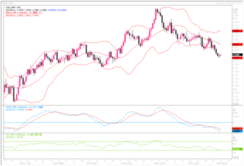 上周五(9月8日),英镑周五在三个月低点略上方徘徊,收盘仍在近期的低位1.2470。周五的一项行业调查显示,对经济前景感到担忧的英国雇主上个月通过招聘机构雇用员工的数量有所减少,减少的速度为三年多来最快。就业市场的放缓导致交易商调低了对英国央行将加息多高的押注。英国央行总裁贝利周三表示,英国央行“更接近”结束连续加息行动,但由于通胀压力居高不下,借贷成本仍可能进一步上升。贝利在议会上的鸽派表现让市场越来越相信,9月份将是英国央行的最后一次加息。英镑之前引以为的利率差优势似乎已渐渐消散。市场上关注的焦点似乎更在意各国在当前高利率成本环境下的经济发展状况。因此,近期美元维持强势,也是逼使英镑退下阵来而出现持续的下滑走势趋向。日线图上,英镑/美元继续受压于各期限均线下方,维持着偏弱格局。目前上方初步阻力在1.25附近,下方1.24的支撑则较为重要,若跌穿,镑美将继续探低。
