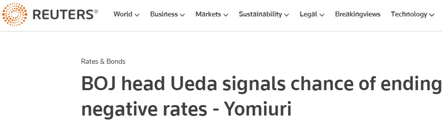 日本《读卖新闻》上周六刊登的文章报导称,日本央行行长植田和男(Kazuo Ueda)表示,当2%的通胀目标即将实现时,央行可能会结束负利率政策,暗示加息的可能性。