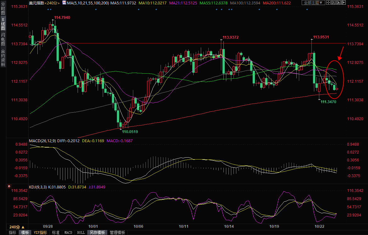 美元指数震荡走弱,目前下跌0.14%,交投于111.83附近。