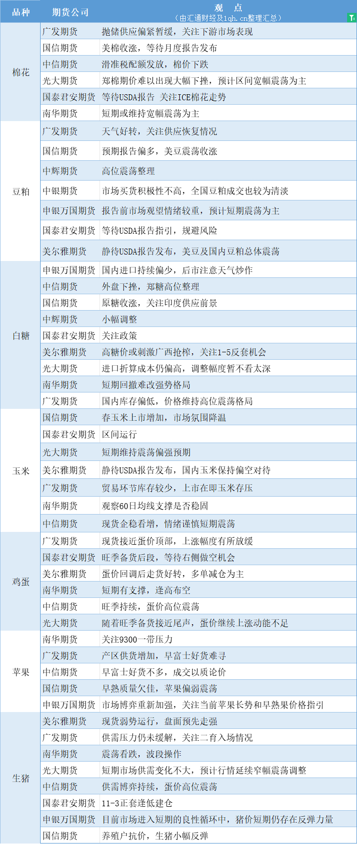 标题:期货公司观点汇总一张图:9月12日农产品(棉花、豆粕、白糖、玉米、鸡蛋、生猪等)