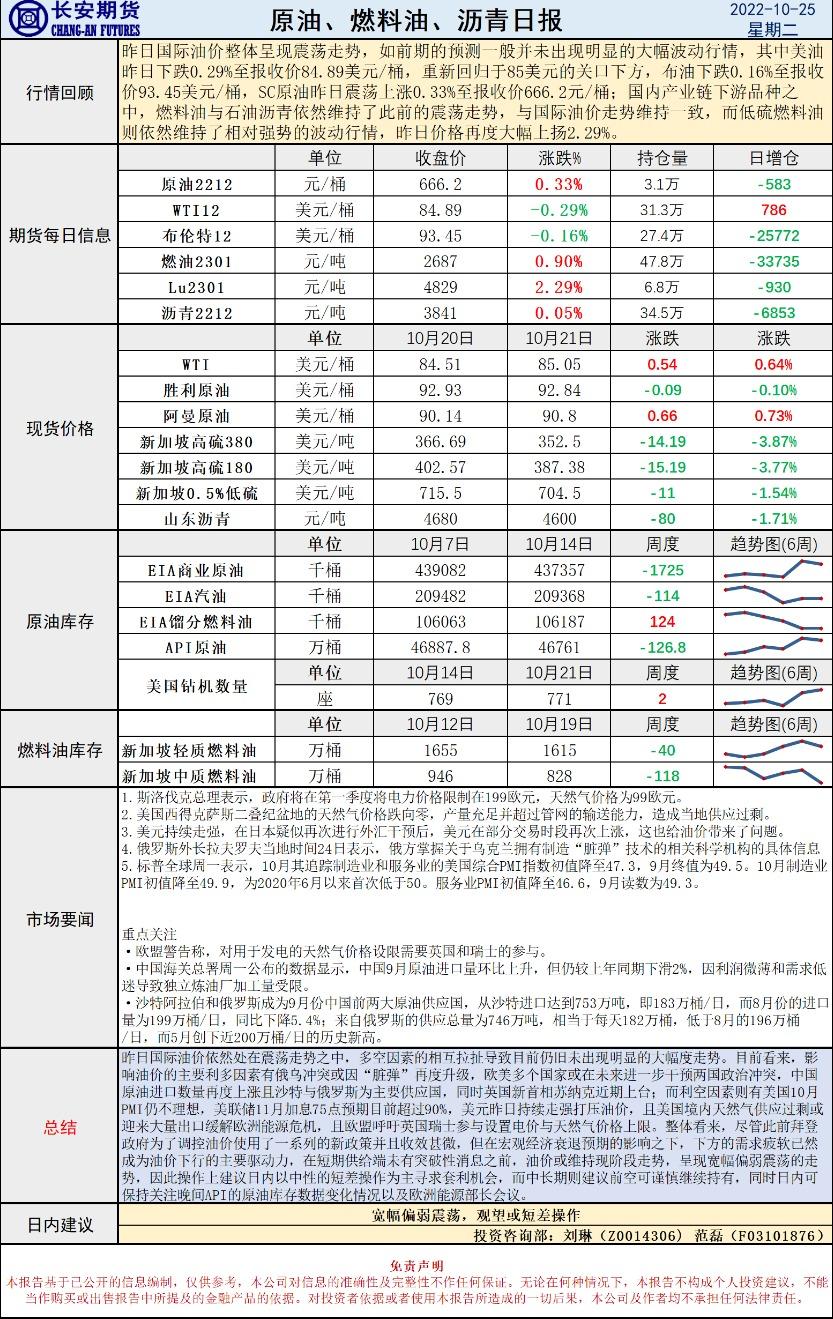 10月25日,长安期货发布原油早评,称美元走强多空交织,油价震荡走势延续下关注欧洲地缘政治,建议观望或短差操作。