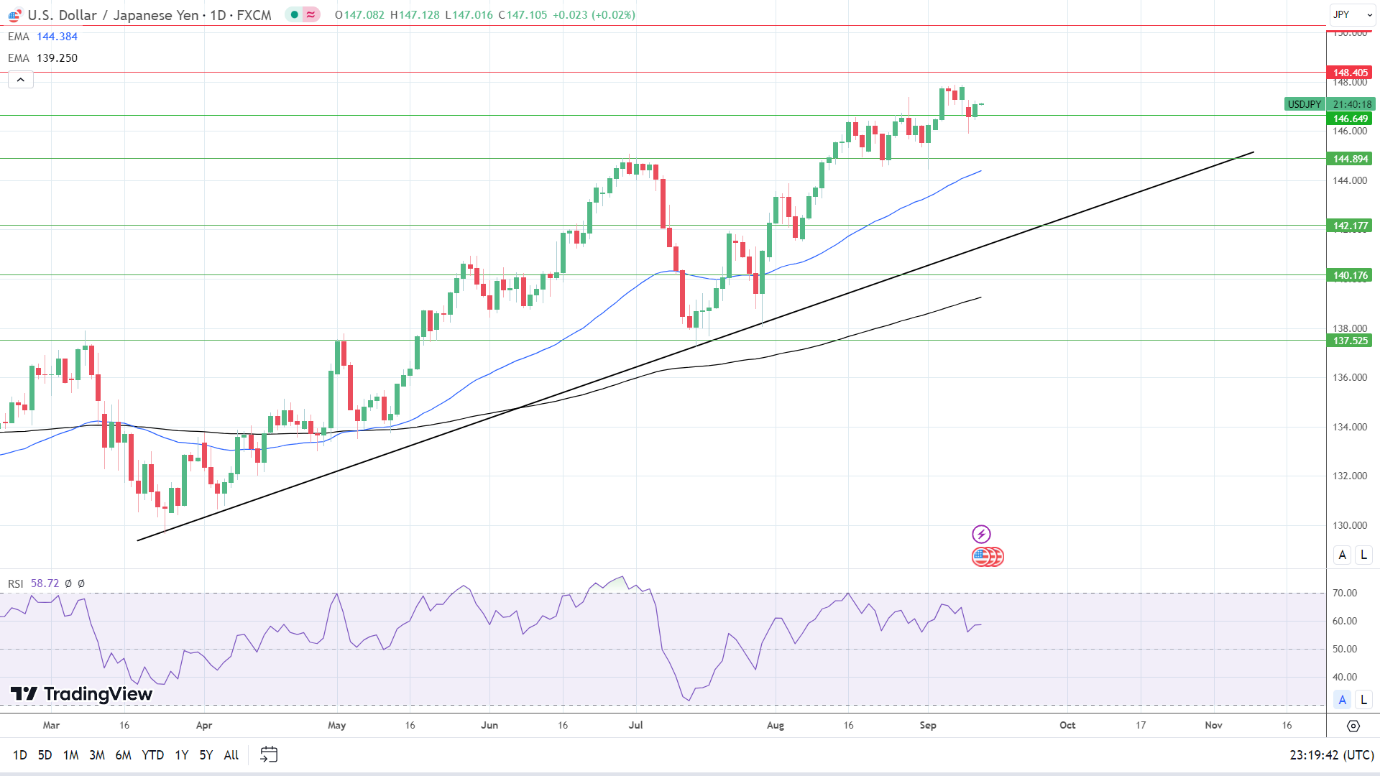 14日RSI为58.72,表明美元/日元在触及超买区域之前可能会重新瞄准148。
