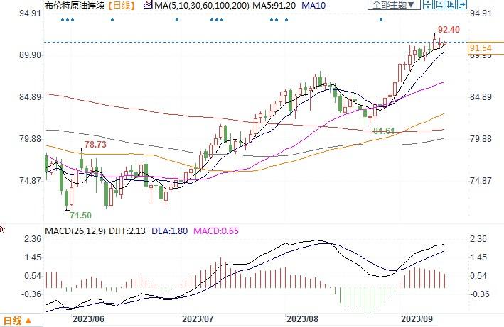 汇通财经APP讯——油价周三飙升至10个月高位,美国原油库存意外增加未能抑制今年剩余时间供应紧张的预期。即月11月布油期货周二收涨1.5%,至92.06美元/桶,为11月16日以来的最高结算价,周三微跌至91.46附近。而美国纽约商品交易所即月10月原油期货收涨0.08%,至88.84美元/桶,为2022年11月11日以来的最高收盘价。WTI原油和布油今年迄今分别上涨了10.7%和7.1%。