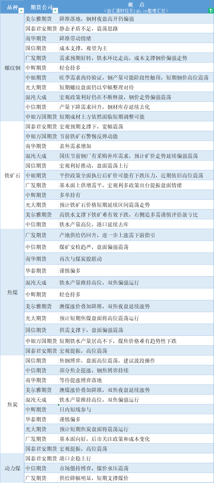 期货公司观点汇总一张图:9月15日黑色系(螺纹钢、焦煤、焦炭、铁矿石、动力煤等)