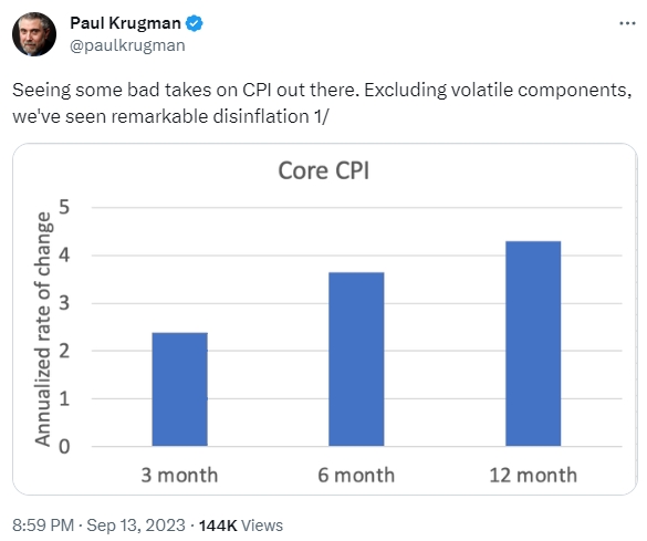 这一事态发展促使市场分析师倾向于预期,美联储将在即将举行的会议上选择加息。在美国劳工统计局发布报告后,克鲁格曼感到有必要发表自己的看法,就他所认为的“对CPI的不良看法”提出个人见解。他强调,如果美国排除“波动性成分”,就会看到显着的通货紧缩。