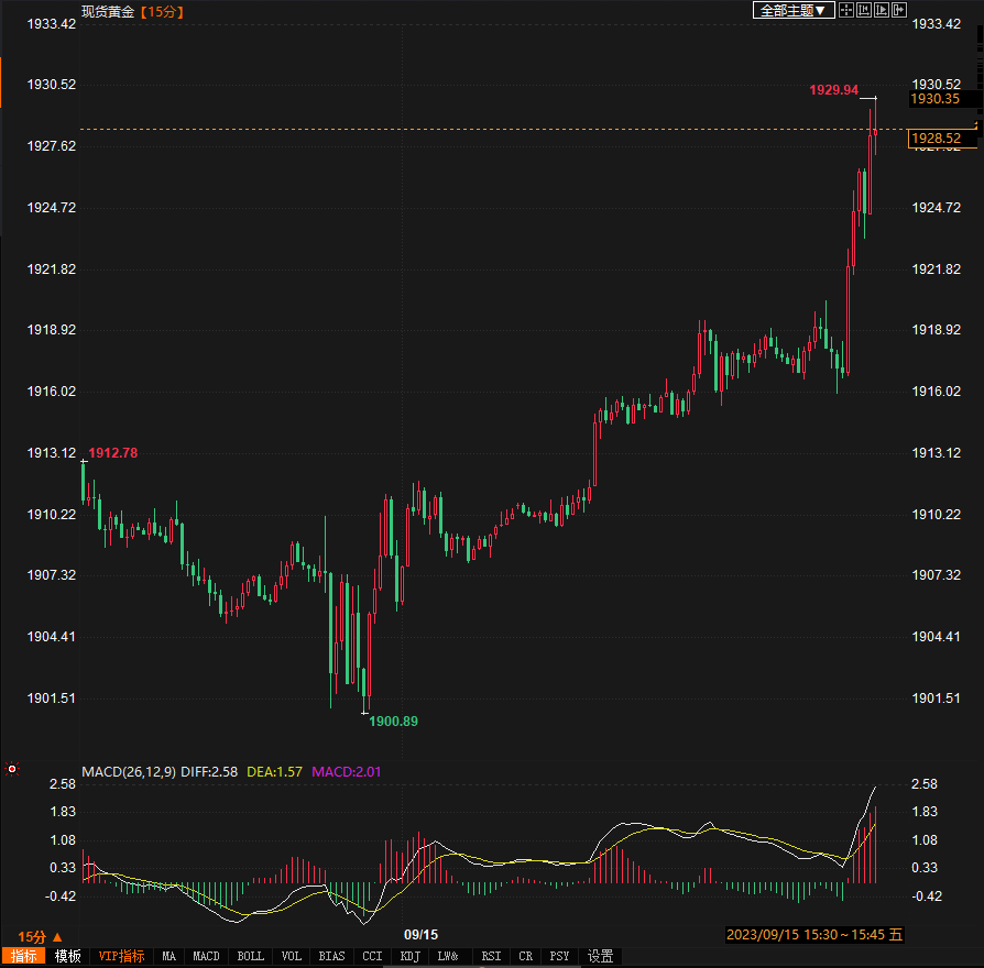 现货黄金15分钟走势图)