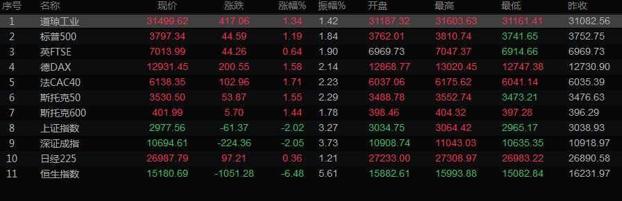 美股收盘情况:道琼斯工业指数上涨1.34%,至31499.62点;