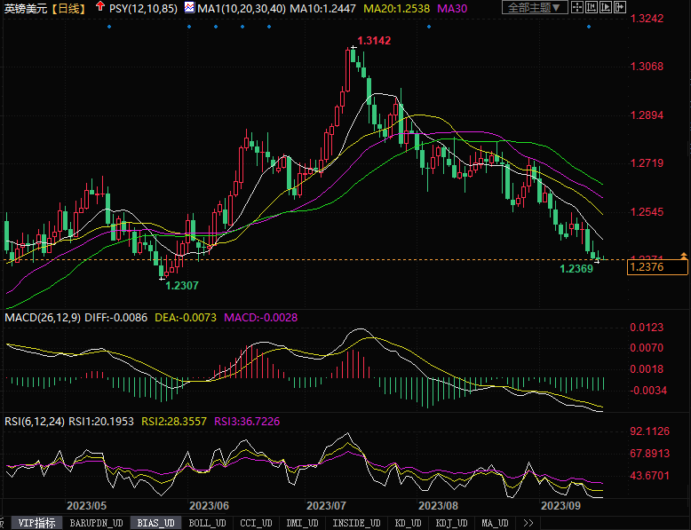 英镑兑美元收盘价与周五持平在1.2385,日内最低曾触及1.2371美元。周一交易清淡,市场波幅不大。交易员们周一正在等待本周晚些时候可能撼动汇市的几项央行利率决定。交易员认为,英国央行周四将上调利率25个基点至5.5%,这可能是本轮紧缩周期的最后一次加息。因英国劳动力市场和经济以及欧元区经济放缓,已不允许英央行继续有太大空间提升利率了。而反观美国,由于其经济表现优于全球大部分国家,从而趋势交易员有非常强烈的共识,认为可能从利率点阵图中能看到美联储一些鹰派立场。也就是说在英镑与美元利率即便持平的情形下,考虑到美国经济的良好表现,美元的吸引力都将会盖过英镑。日线图上,镑美继续沿布林带通道下轨线下行,短线也显现不出一丝反弹整理的欲求。恐怕英镑/美元逃不脱逢高被沽售的交易节奏。