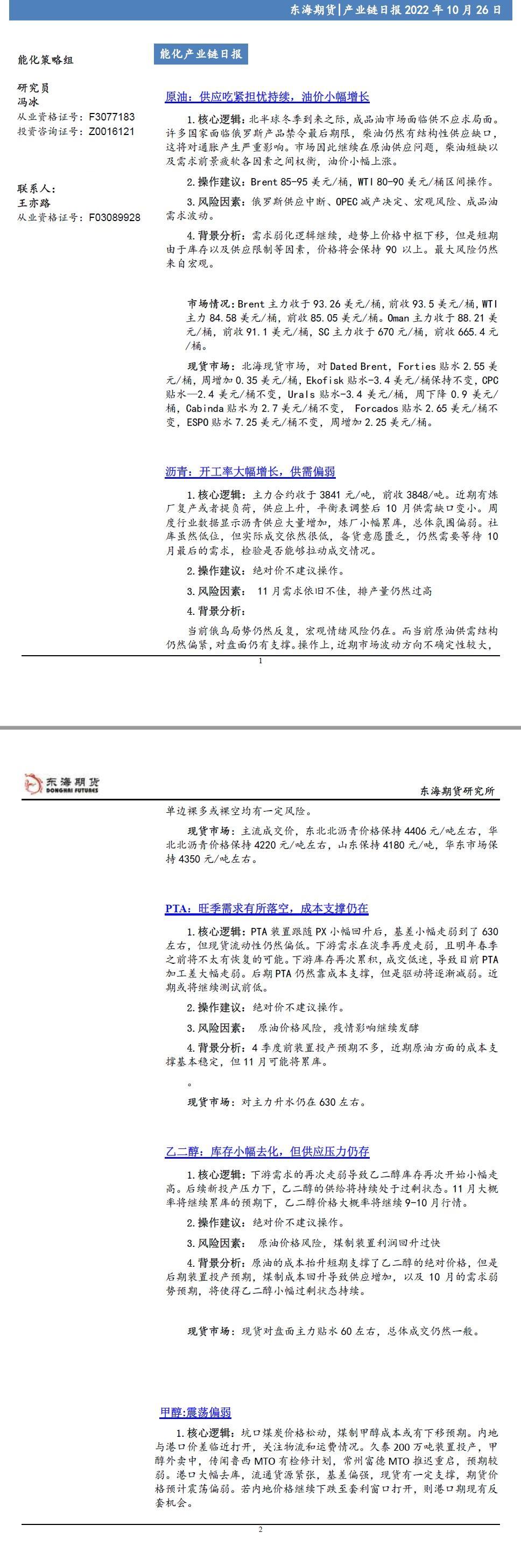 标题:【东海期货10月26日产业链日报】能化篇:供应吃紧担忧持续,油价小幅增长