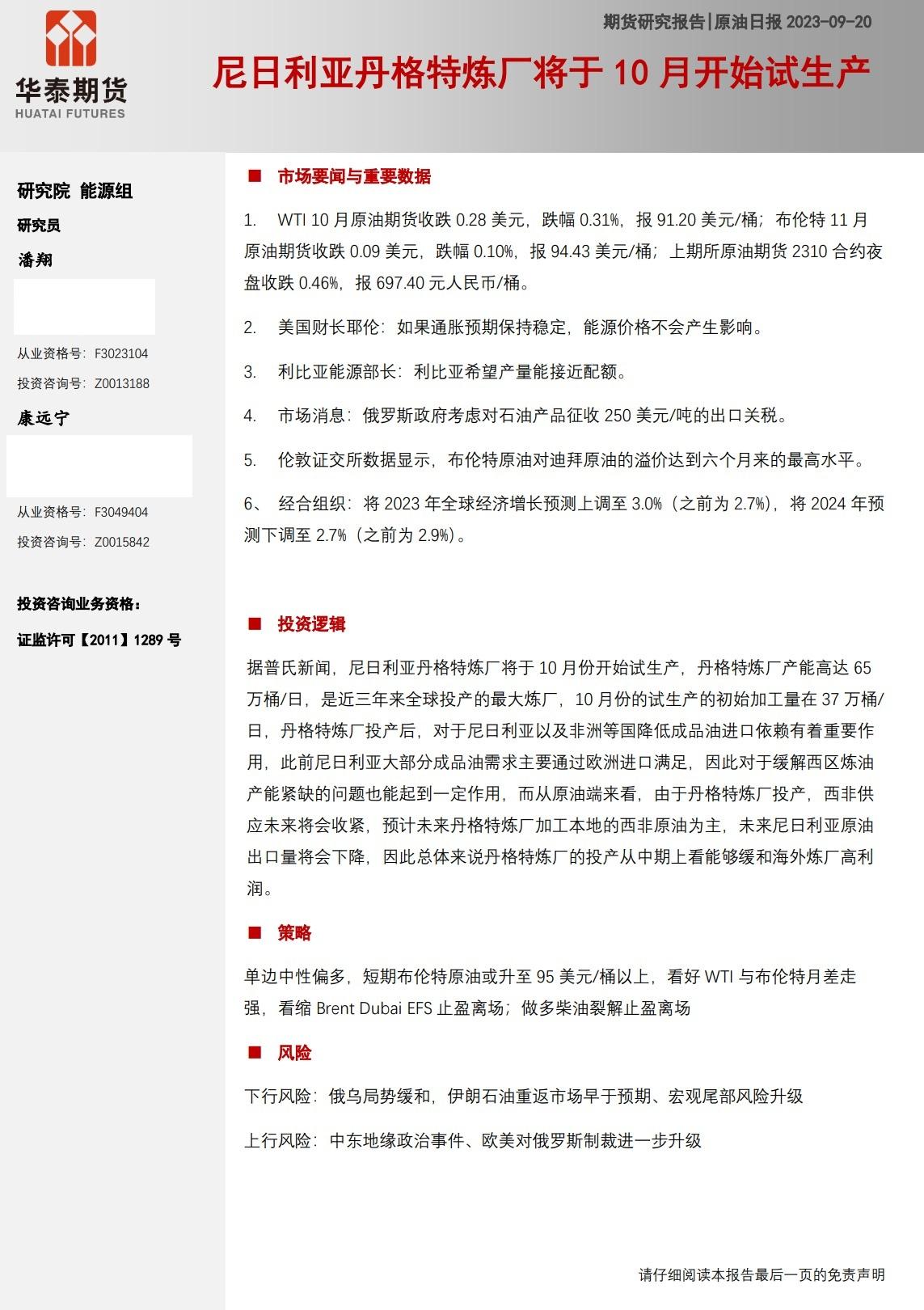标题:华泰期货9月20日原油日报:尼日利亚丹格特炼厂将于10月开始试生产