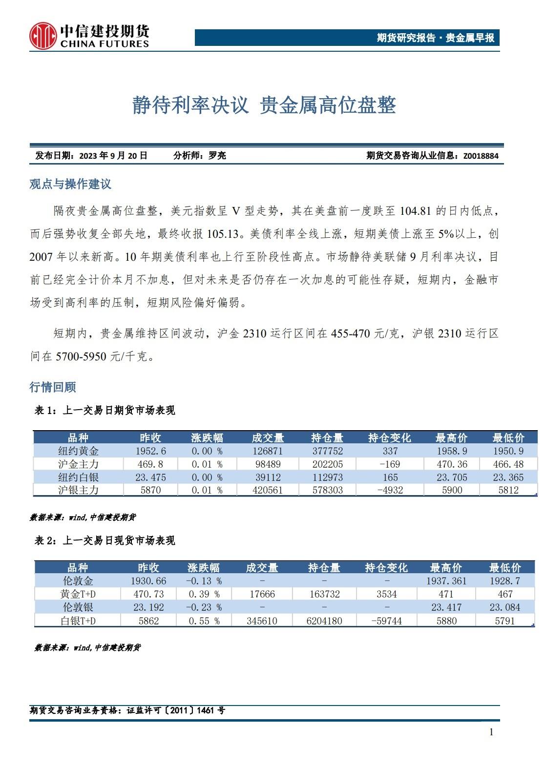 标题:中信建投期货9月20日贵金属日报:静待利率决议 贵金属高位盘整