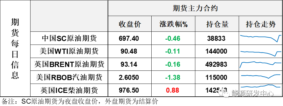 【1】WTI主力原油期货收跌0.1美元,跌幅0.11%,报90.48美元/桶;布伦特主力原油期货收跌0.15美元,跌幅0.16%,报93.14美元/桶;INE原油期货收跌0.46%,报697.4元。