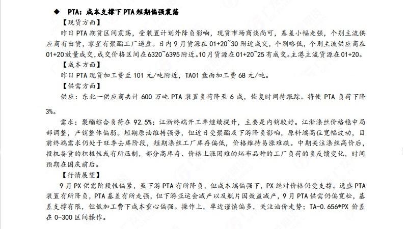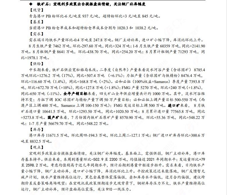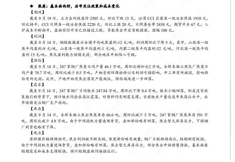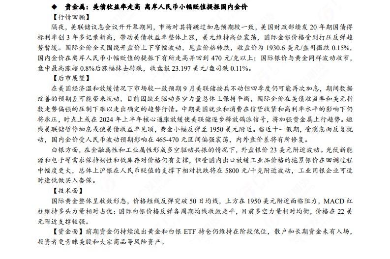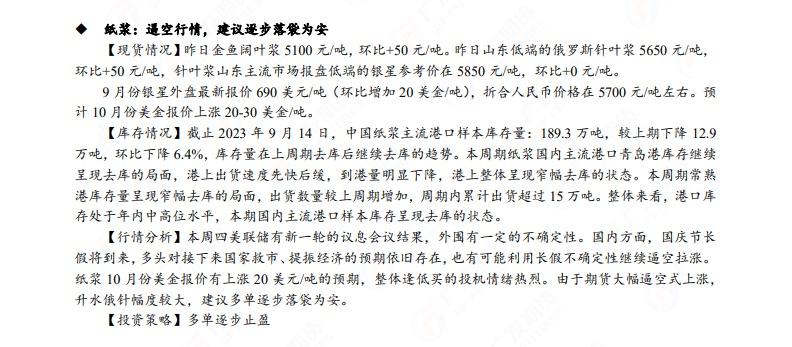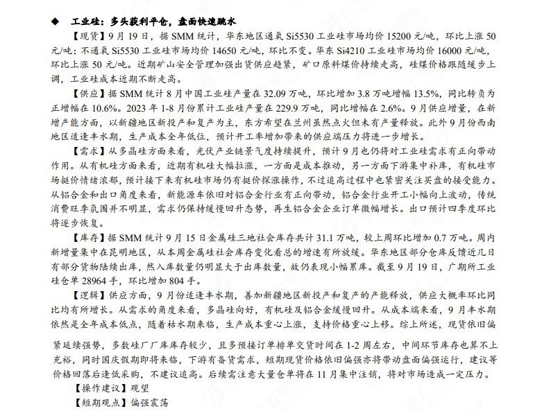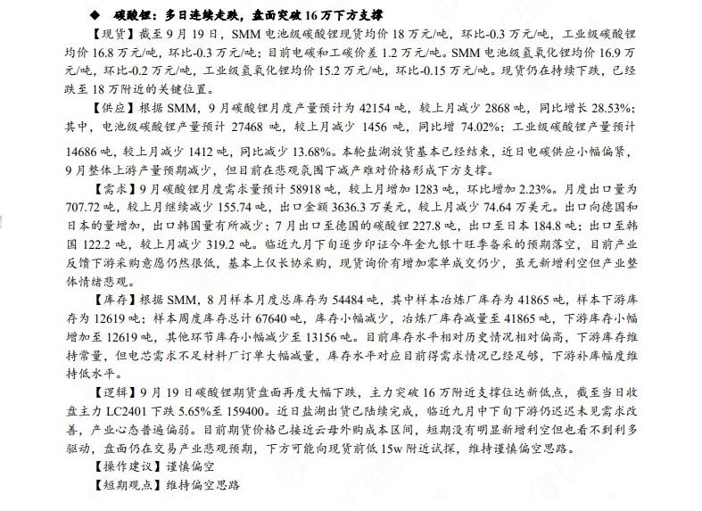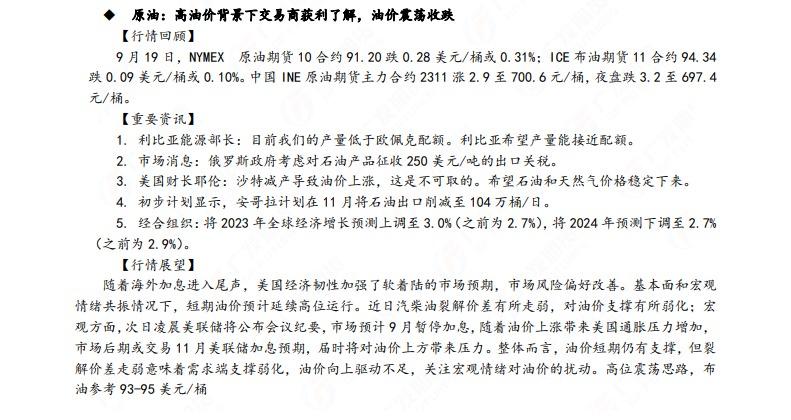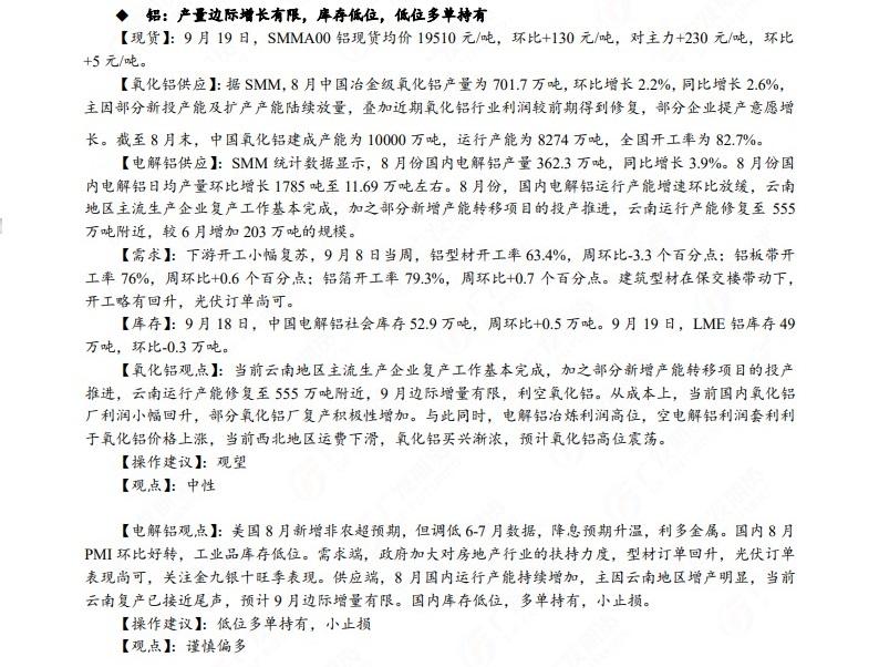广发期货发布9月20日早知道,建议铝低位多单持有,小止损;碳酸锂维持偏空思路;钢材偏强震荡走势,铁矿石预计盘面高位震荡,关注910一线压力;焦炭短期预计仍偏强运行;原油高位震荡思路,布油参考93-95美元;纸浆多单逐步止盈,工业硅偏强震荡。