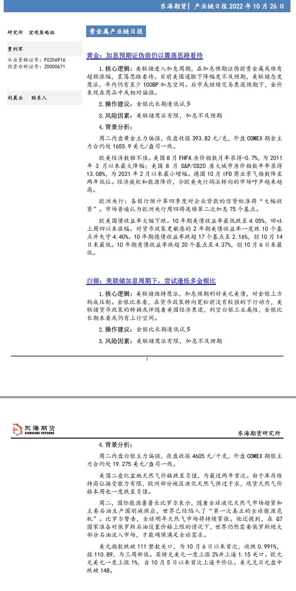 标题:【东海期货10月26日产业链日报】贵金属篇:美元走弱,金银宽幅震荡
