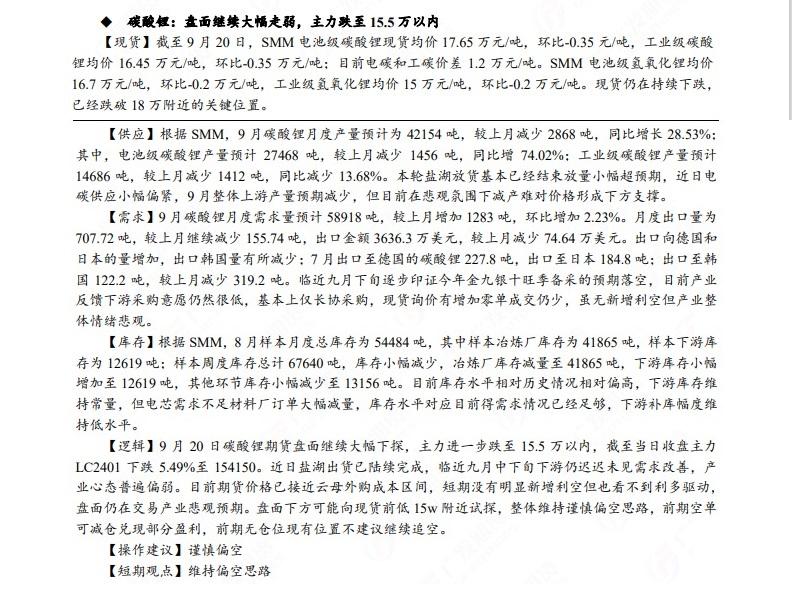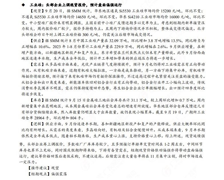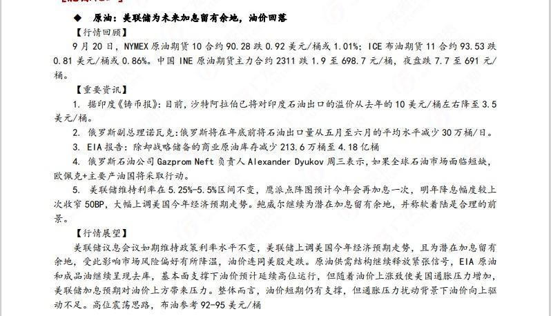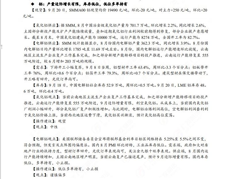 广发期货发布9月21日早知道,建议铝低位多单持有,小止损;碳酸锂维持偏空思路;当前宏观情绪转暖叠加成本支撑钢价偏强走势,白糖待技术企稳后短多操作;原油高位震荡思路,布油参考93-95美元;工业硅偏强震荡。