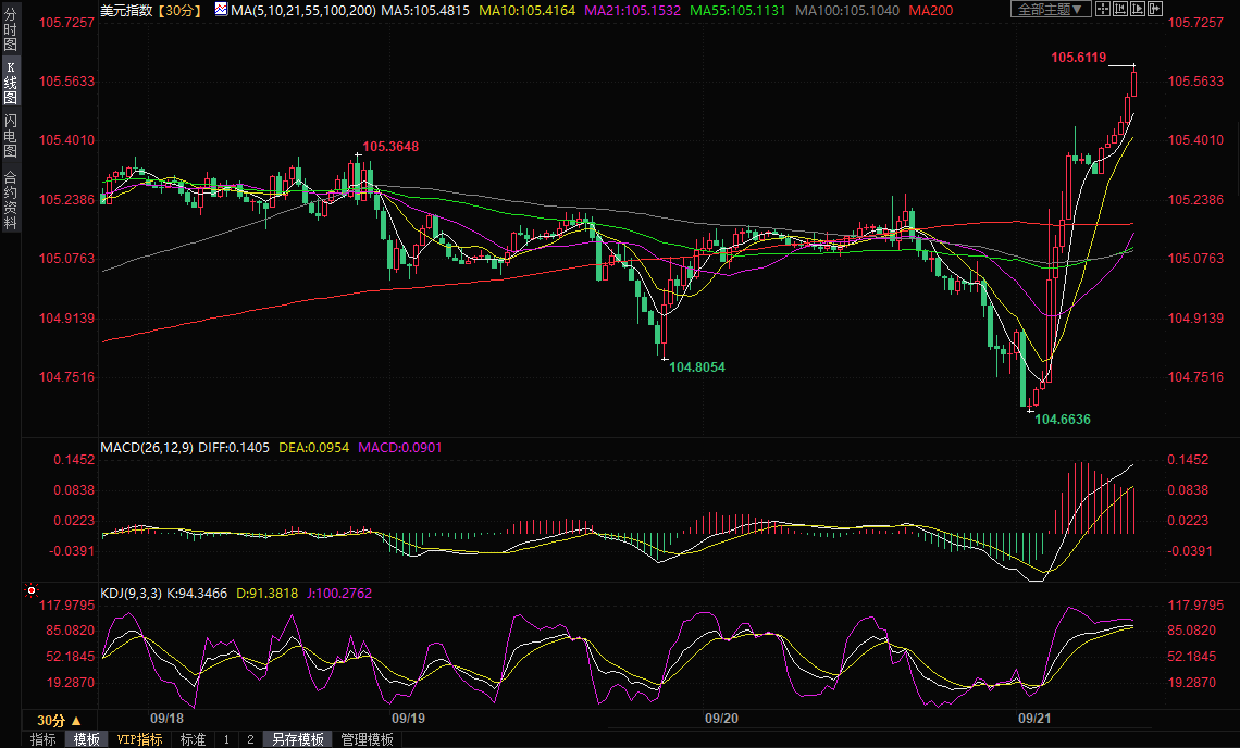 美元指数延续反弹走势,一度创逾半年新高至105.61,周三纽约时段美联储决议释放鹰派信号,这刺激美元短线飙升。