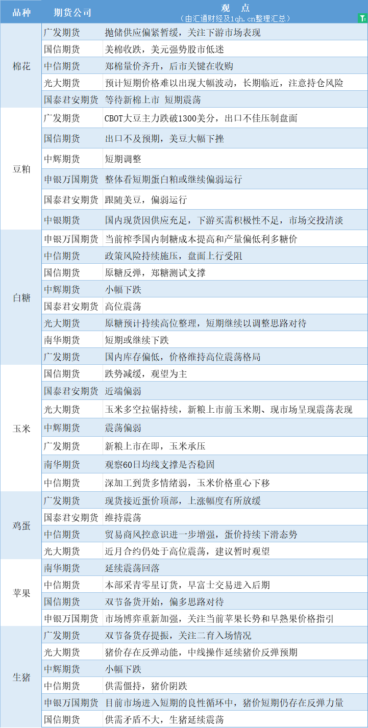 标题:期货公司观点汇总一张图:9月22日农产品(棉花、豆粕、白糖、玉米、鸡蛋、生猪等)
