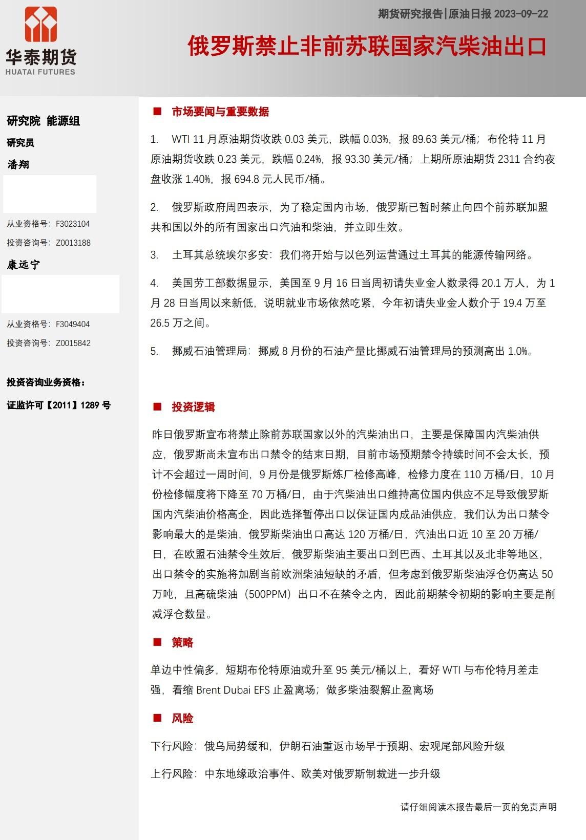标题:华泰期货9月22日原油日报:俄罗斯禁止非前苏联国家汽柴油出口