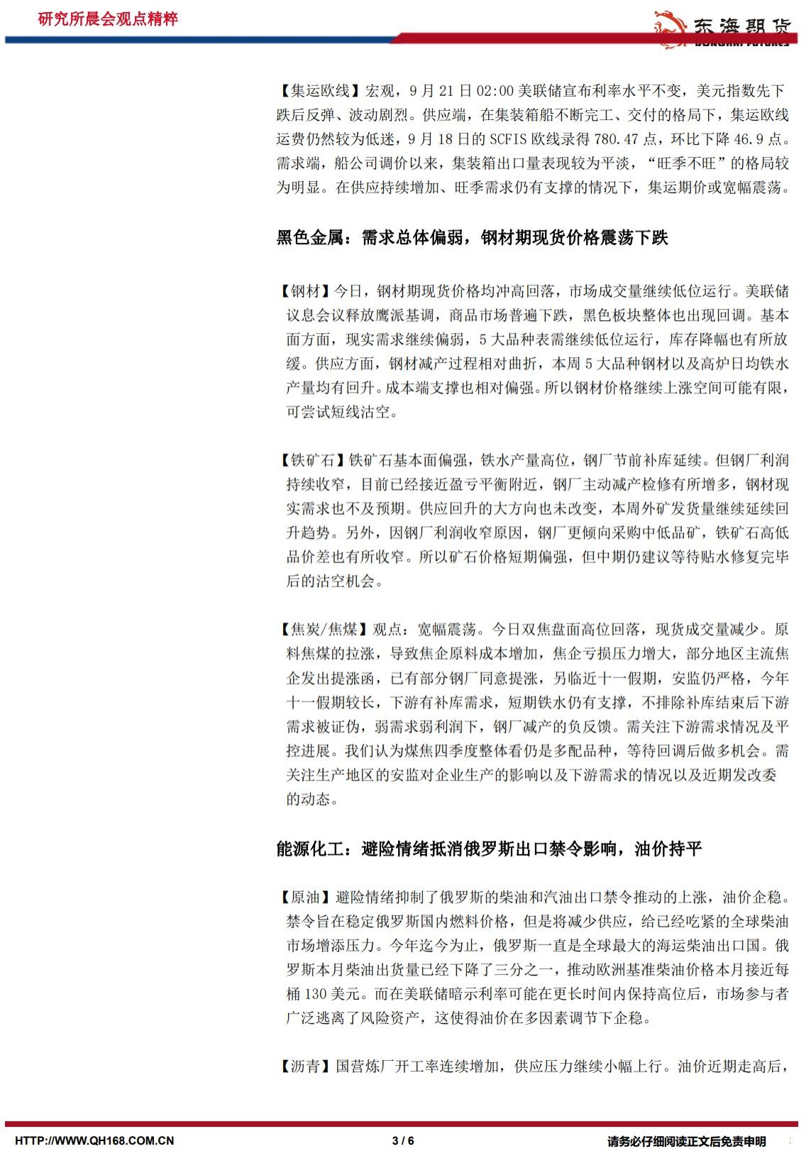 标题:【东海期货9月22日研究所晨会观点精萃】美债收益率继续上涨,全球风险偏好大幅降温