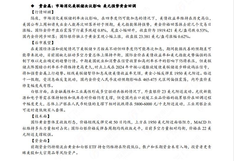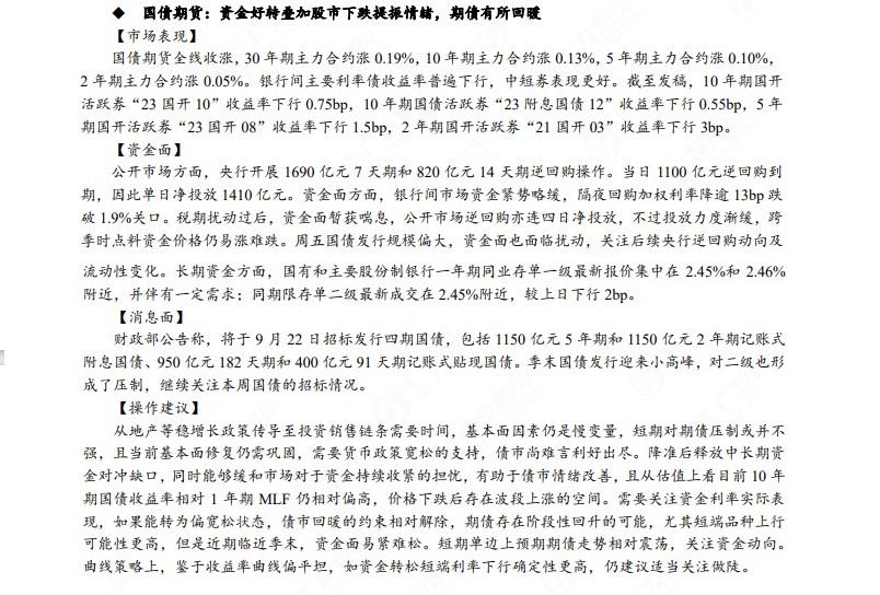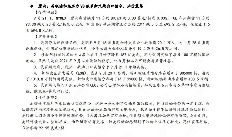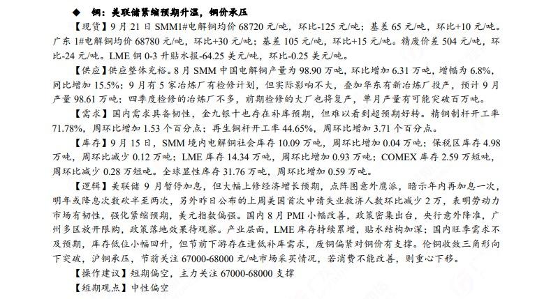 广发期货发布9月22日早知道,短期单边上预期期债走势相对震荡,关注资金动向,如资金转松短端利率下行确定性更高,仍建议适当关注做陡;铜短期偏空,主力关注67000-68000支撑;铝低位多单持有,小止损;钢材延续偏强走势;焦煤盘面回调后仍会偏强运行,原油高位震荡思路,布油参考92-95美元。