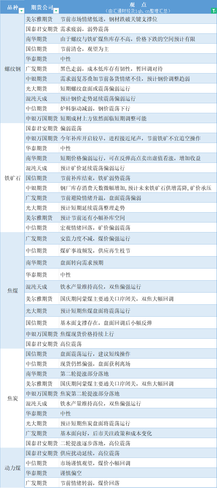 标题:期货公司观点汇总一张图:9月27日黑色系(螺纹钢、焦煤、焦炭、铁矿石、动力煤等)
