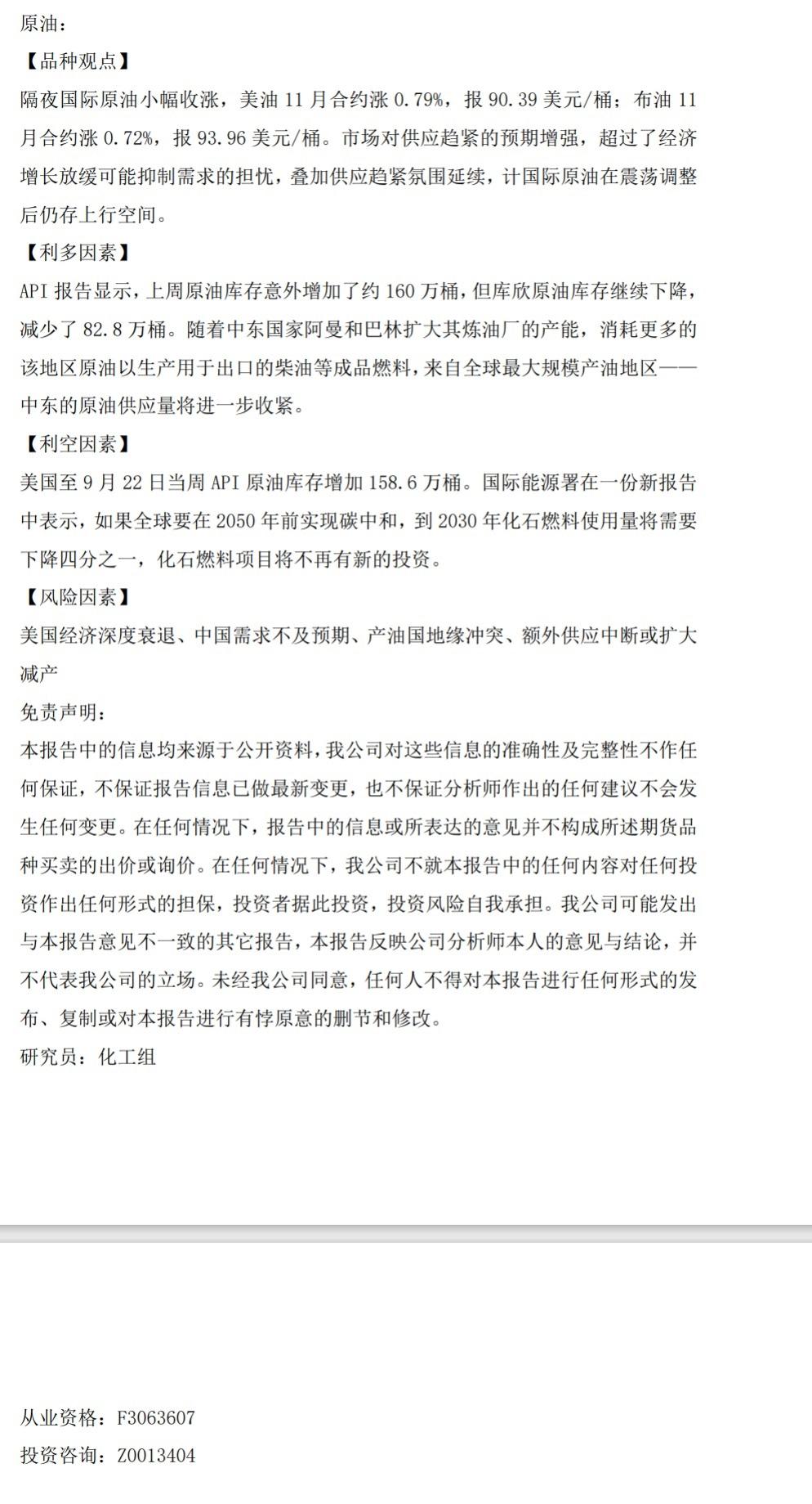 汇通财经APP讯——隔夜国际原油小幅收涨,美油11月合约涨0.79%,报90.39美元/桶;布油11月合约涨0.72%,报93.96美元/桶。市场对供应趋紧的预期增强,超过了经济增长放缓可能抑制需求的担忧,叠加供应趋紧氛围延续,计国际原油在震荡调整后仍存上行空间。