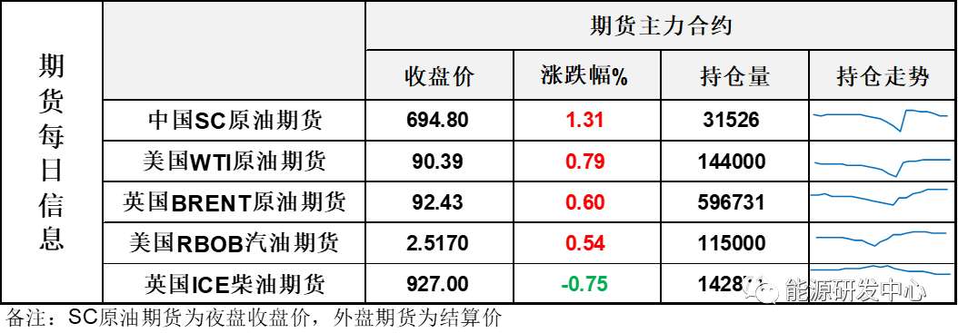 【1】WTI主力原油期货收涨0.71美元,涨幅0.79%,报90.39美元/桶;布伦特主力原油期货收涨0.55美元,涨幅0.6%,报92.43美元/桶;INE原油期货收涨1.31%,报694.8元。