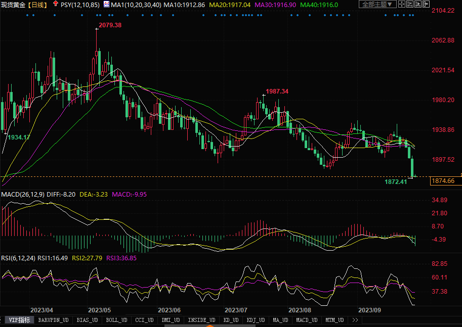 汇通财经APP讯——周三(9月27日), 随着美元和美债收益率双双攀升,黄金继续遭受重创,日内彻底跌穿1900和前期强支撑1880关口,盘中最低一度触及三个月以来的低点1872美元,最后也低收盘在1874.57美元水平,全日跌幅达1.35%。